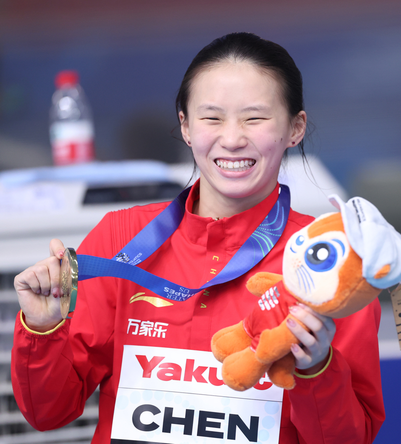 新华社照片,新加坡,2025年7月31日\n 7月31日,中国选手陈芋汐在颁奖仪式后。\n 当日,在新加坡举行的2025年世界游泳锦标赛跳水女子10米跳台决赛中,中国选手陈芋汐夺冠。\n 新华社记者 雒圆 摄